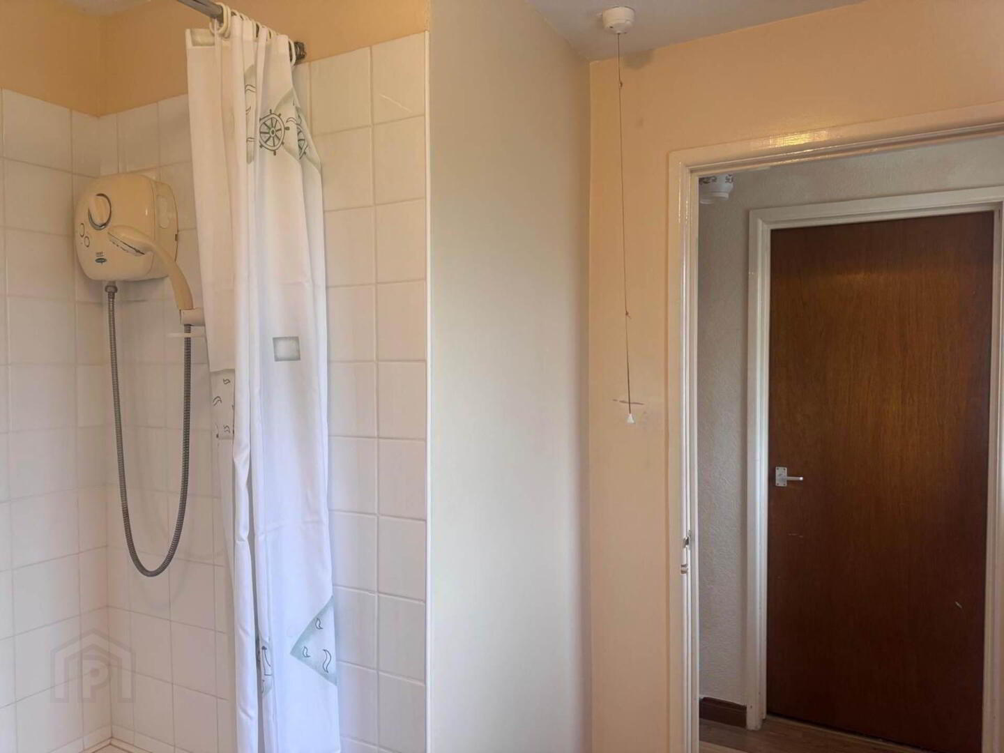 Bath with telephone hand shower; pedestal wash hand basin; low flush toilet; vinyl flooring; tiling over bath; wash hand basin and around toilet cistern; curtain pole; shoer curtain; electric `showerforce` shower over bath; extractor fan.