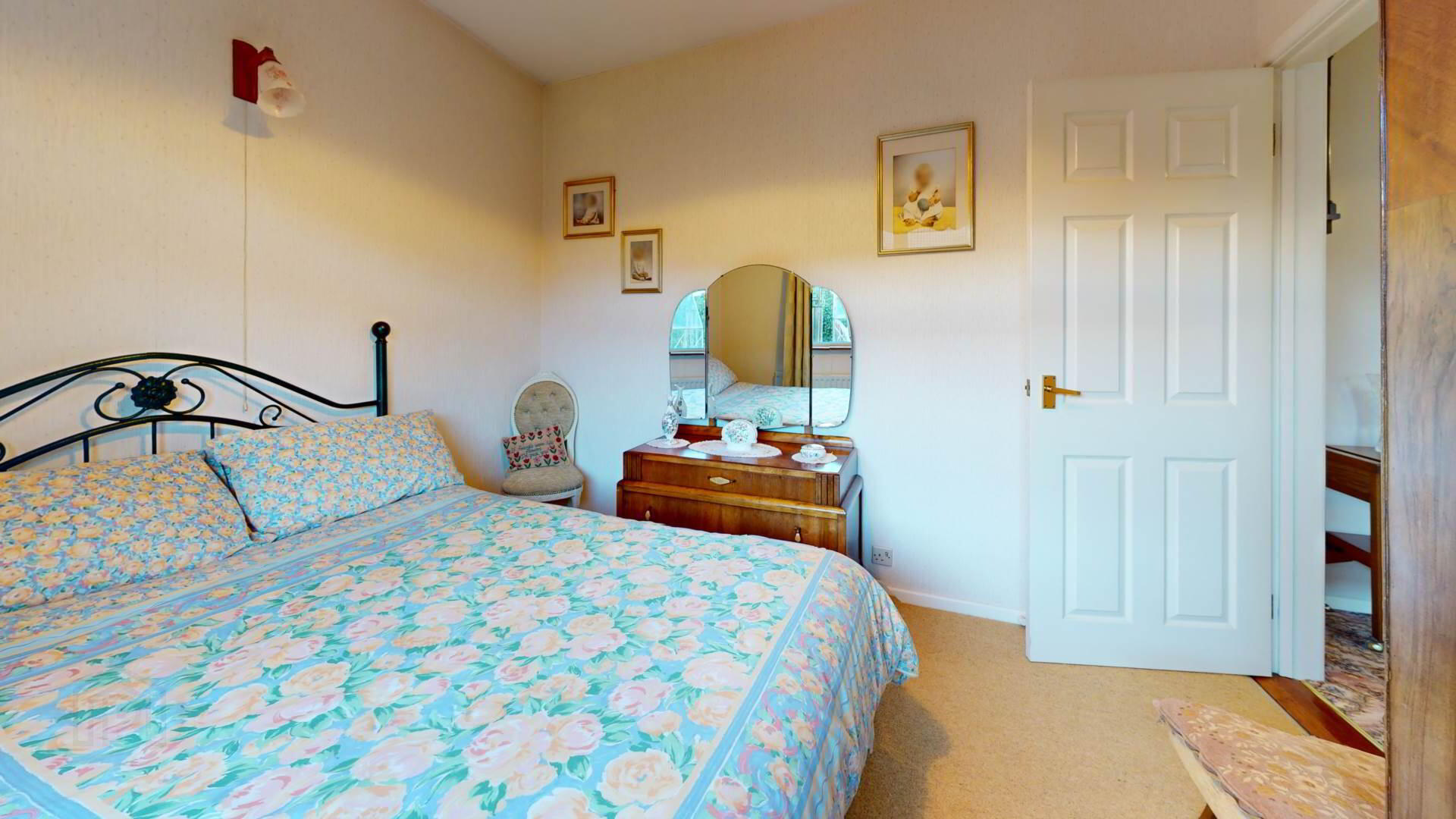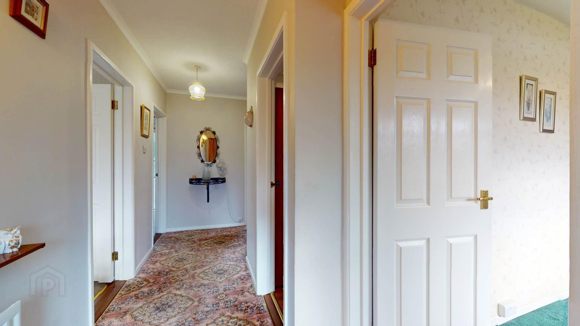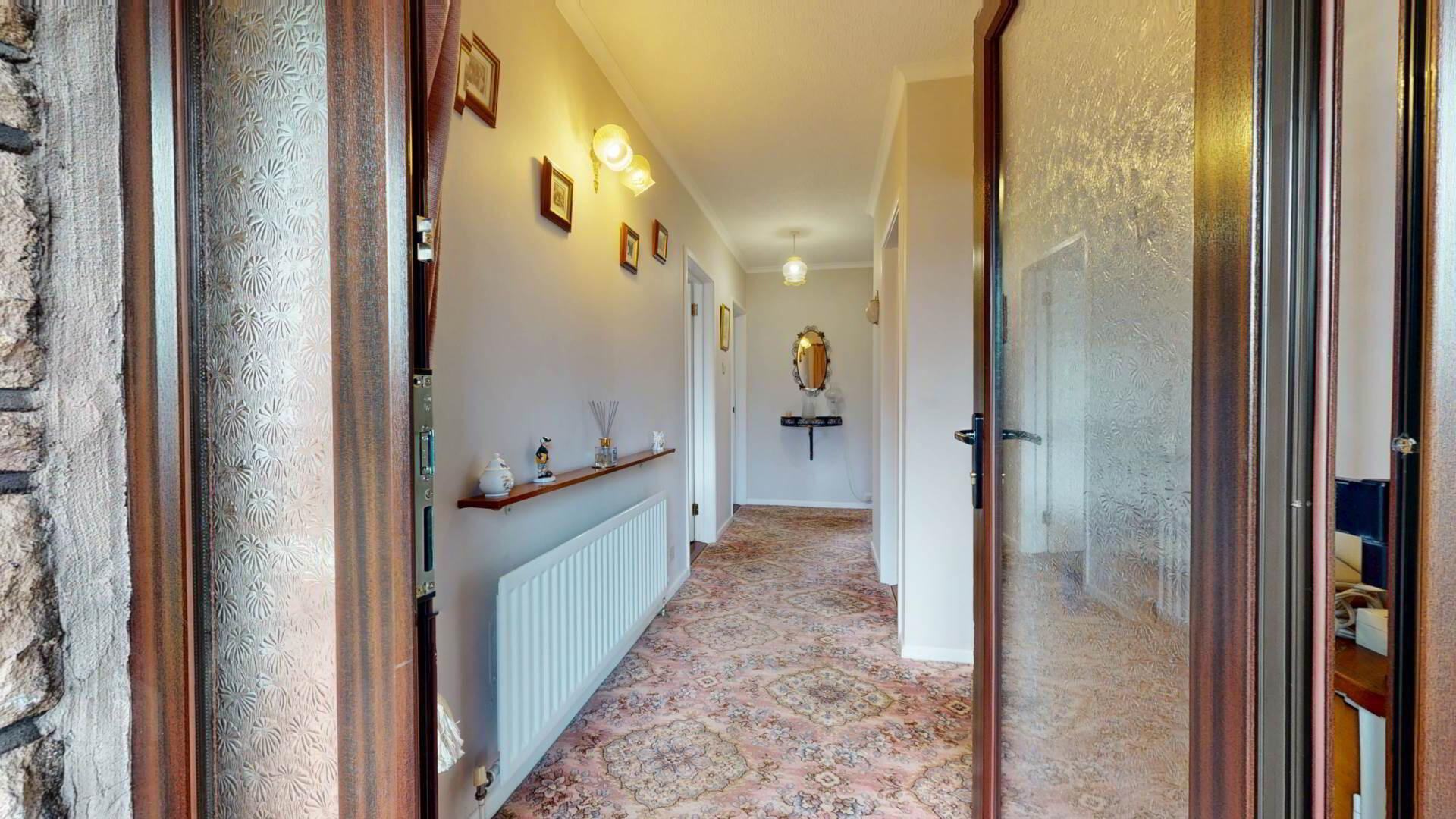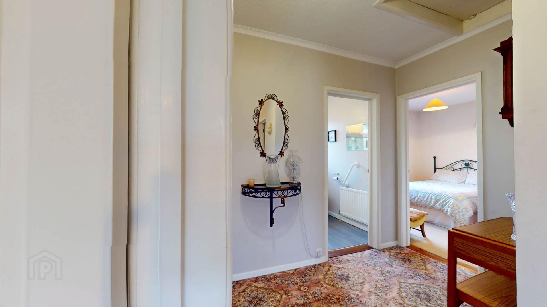 carpeted; wall lighting; loft access; smoke detection.