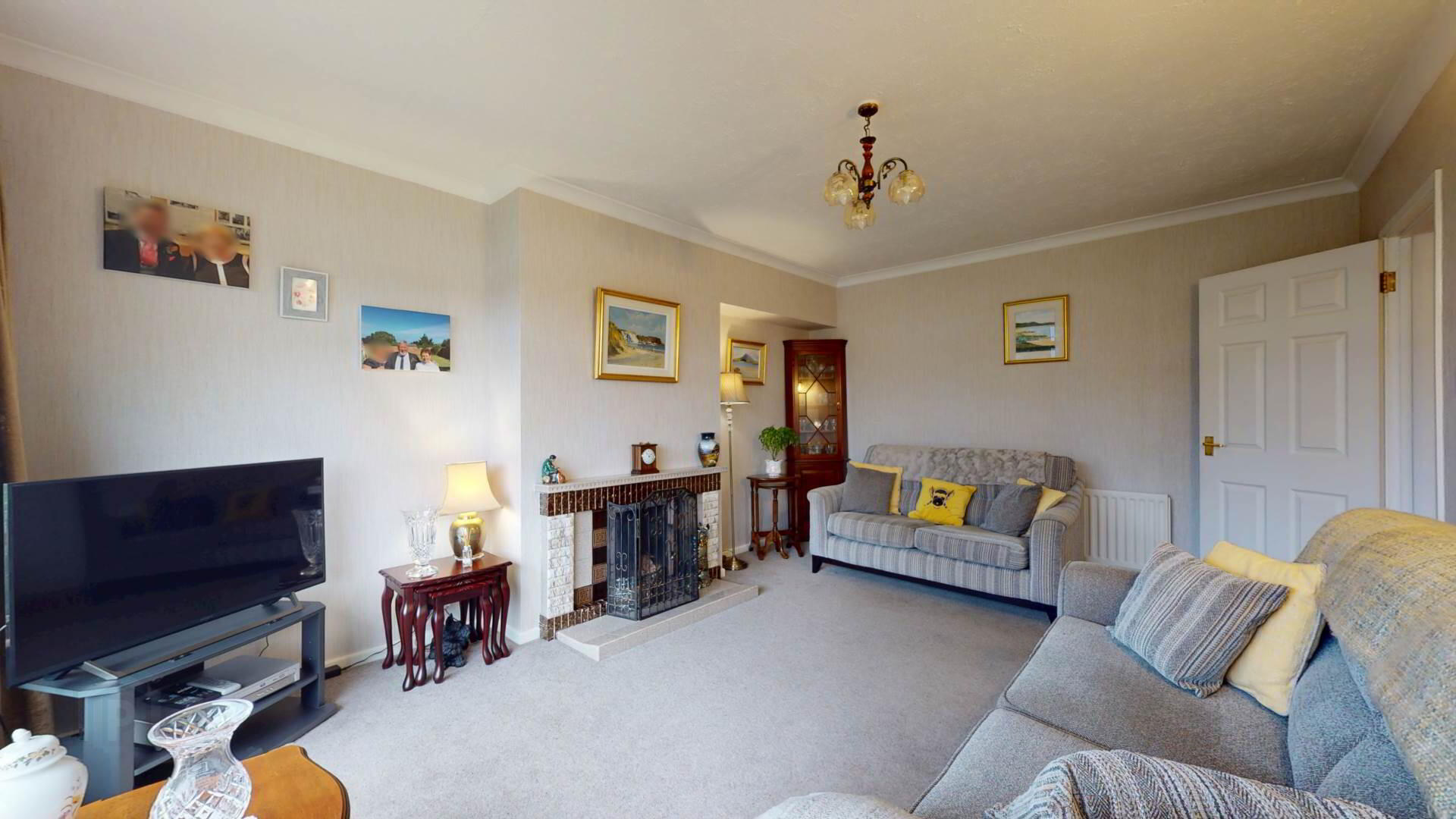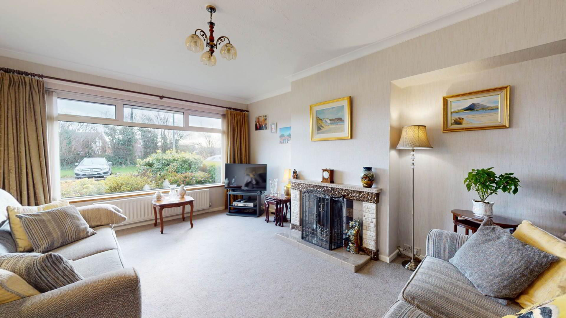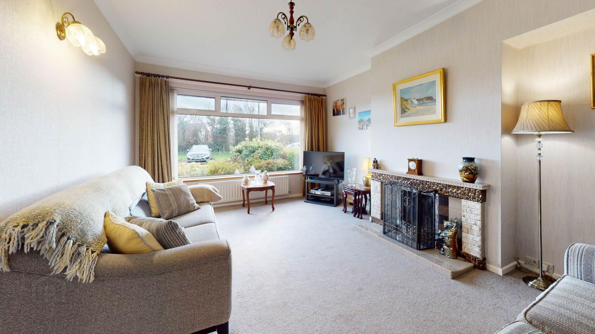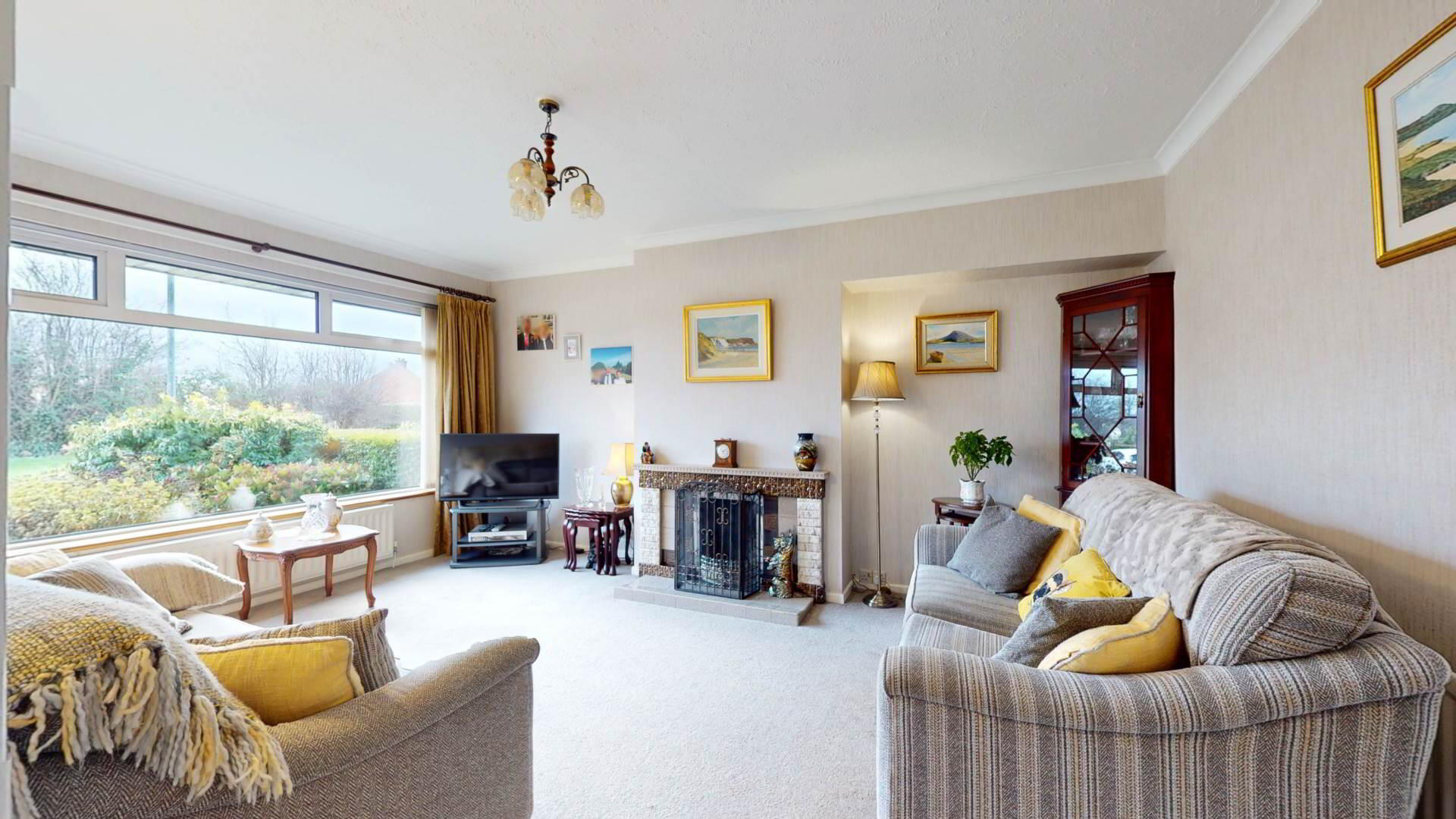 carpeted; tiled hearth; overmantle and inset with solid fuel fire with back boiler; curtains; poles; vertical blinds; coving to ceiling.