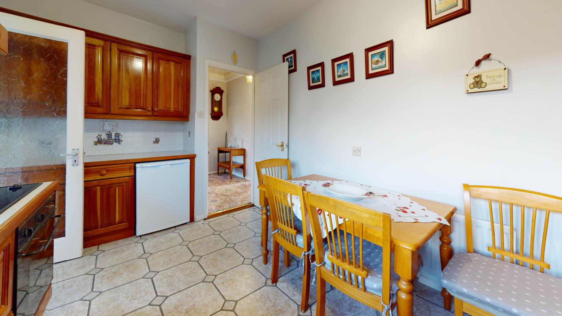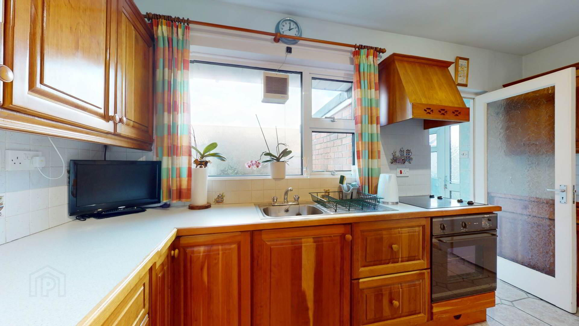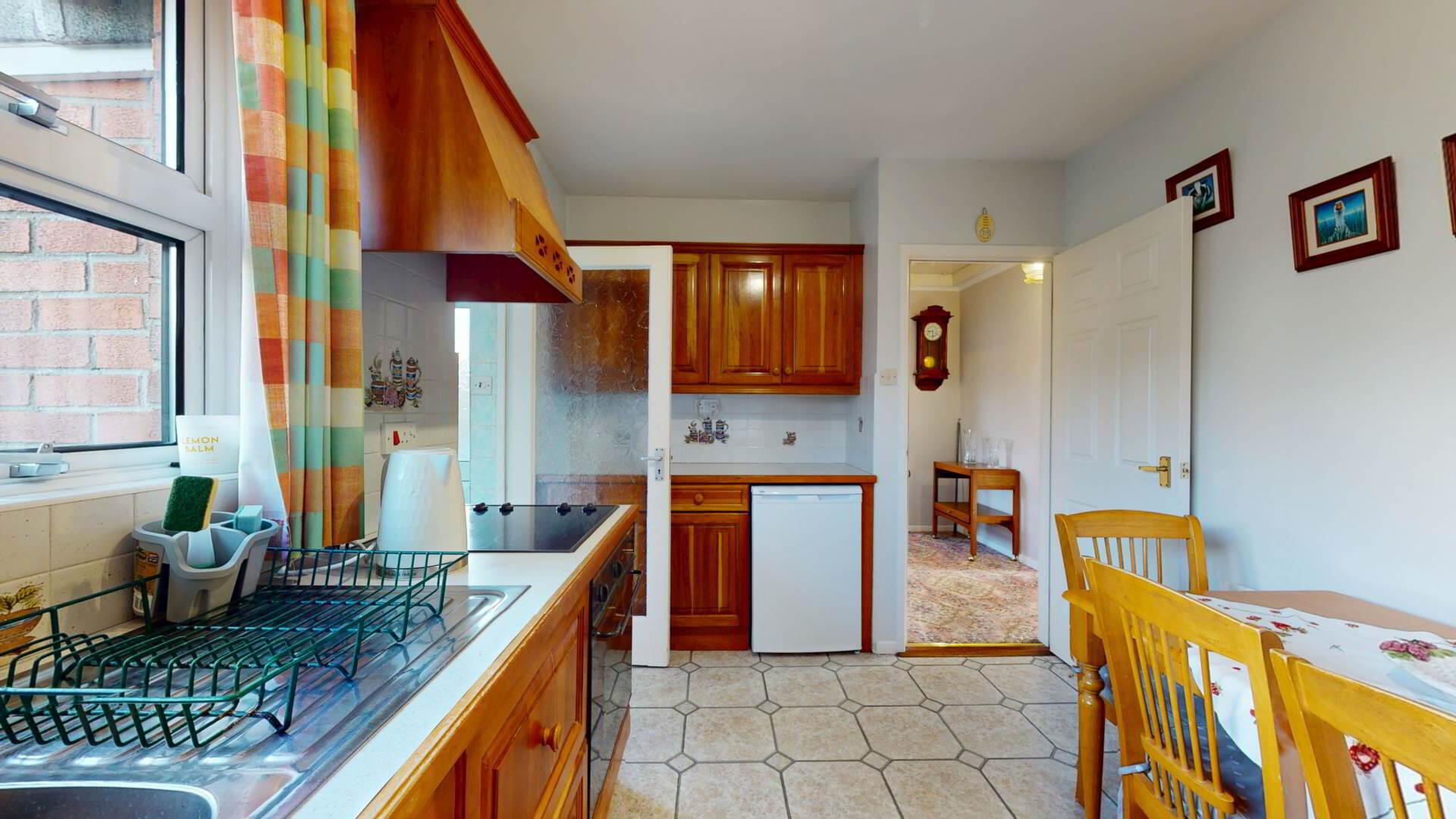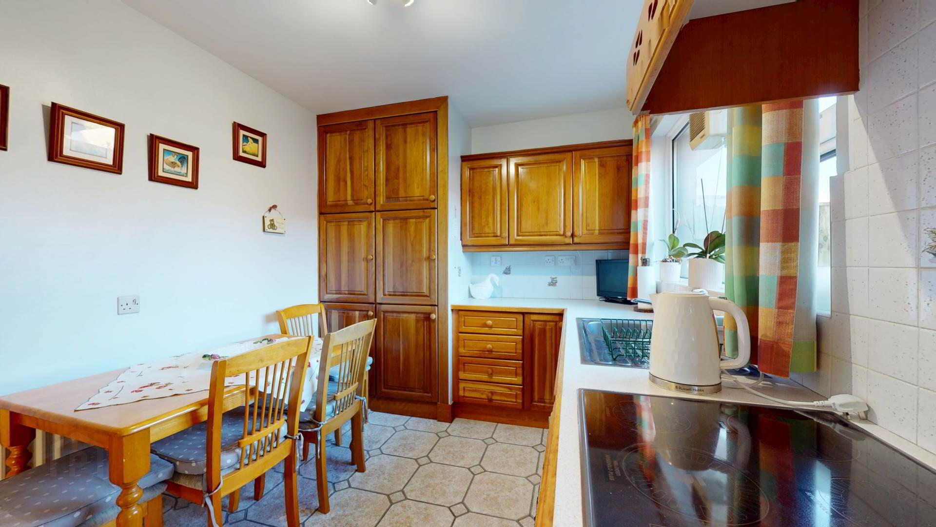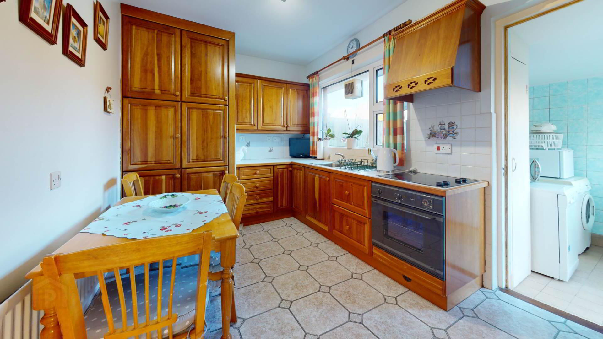 Cherry kitchen; high and low level units with concealed lighting; under eye leve units; drawer unit; electric `Hotpoint` hob with ` Hotpoint` under oven; space for under work surface fridge freezer; owerpoints; curtain and pole.