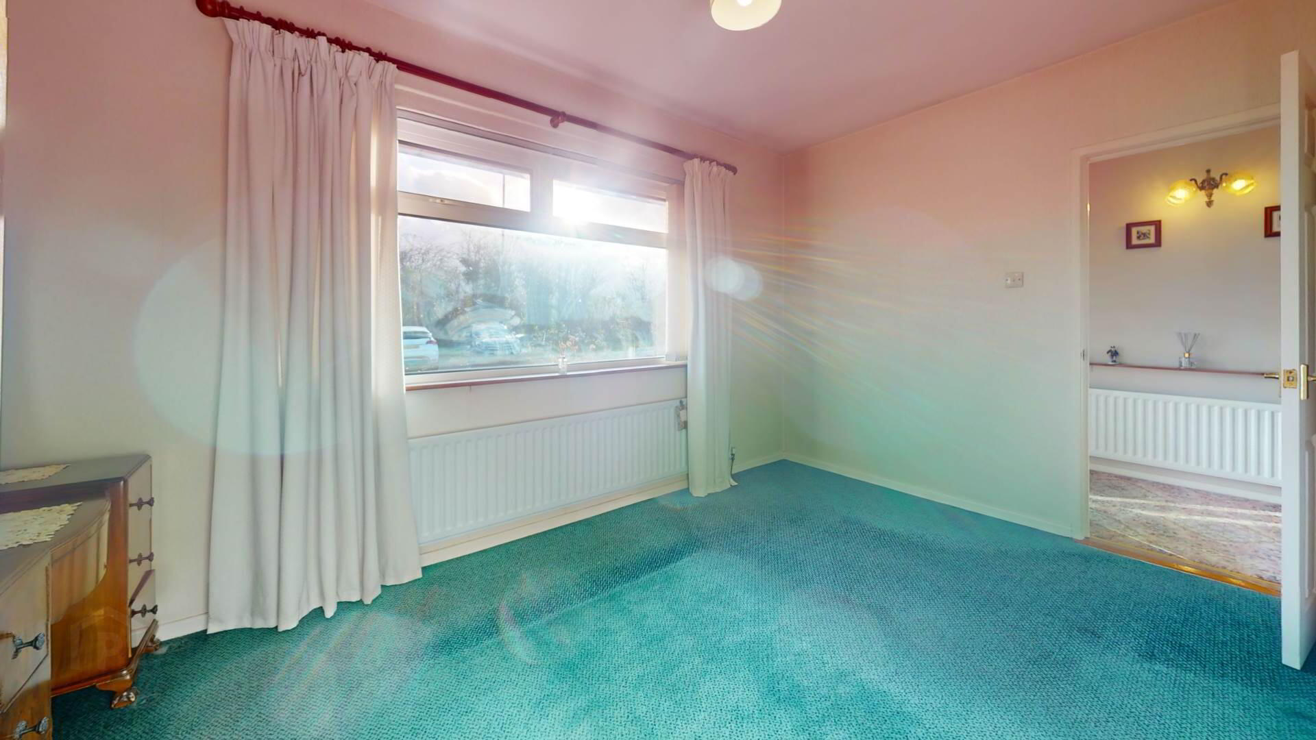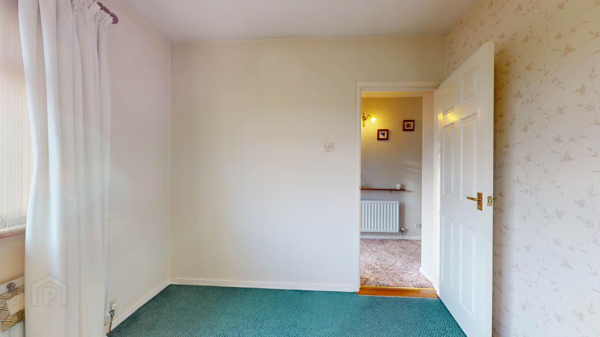 carpeted; roller blind; curtains and pole; powerpoint.