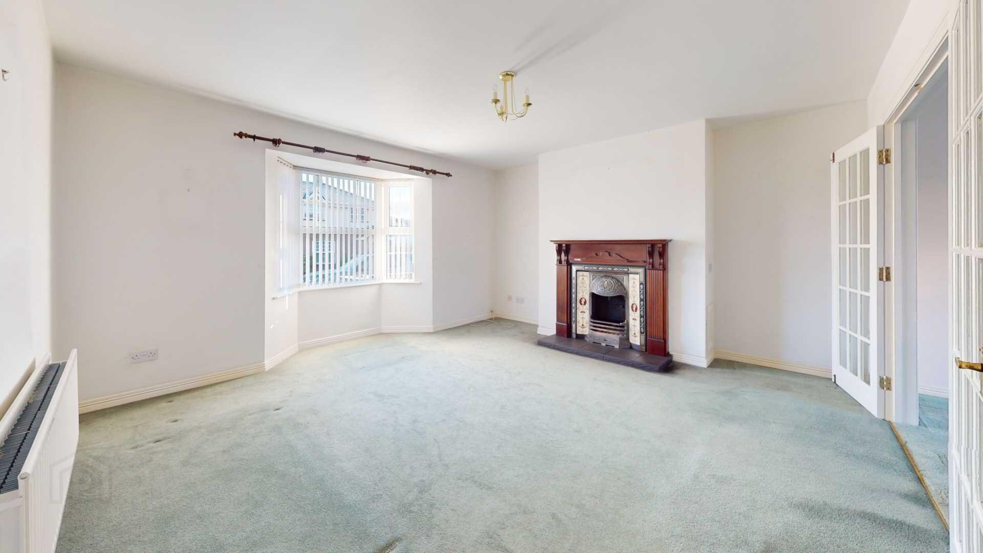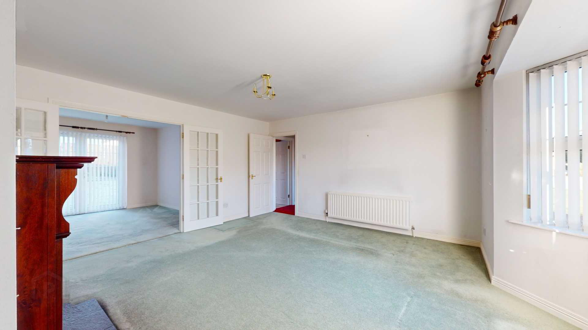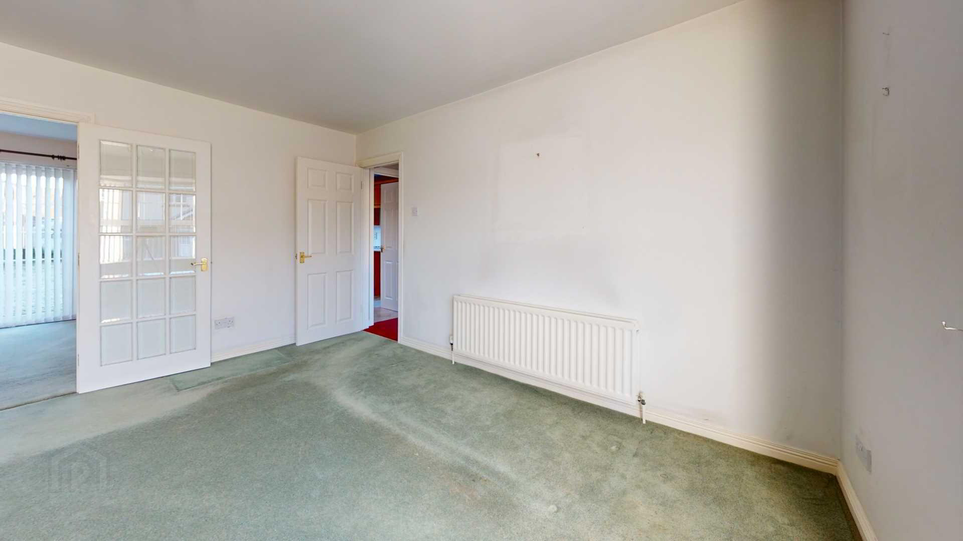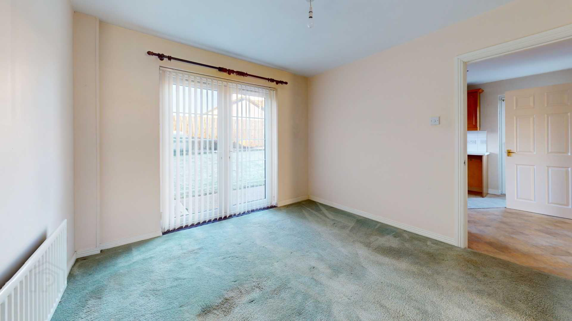 French doors off; carpeted; powerpoints; vertical blinds with French external uPvc door to rear garden; curtain pole.