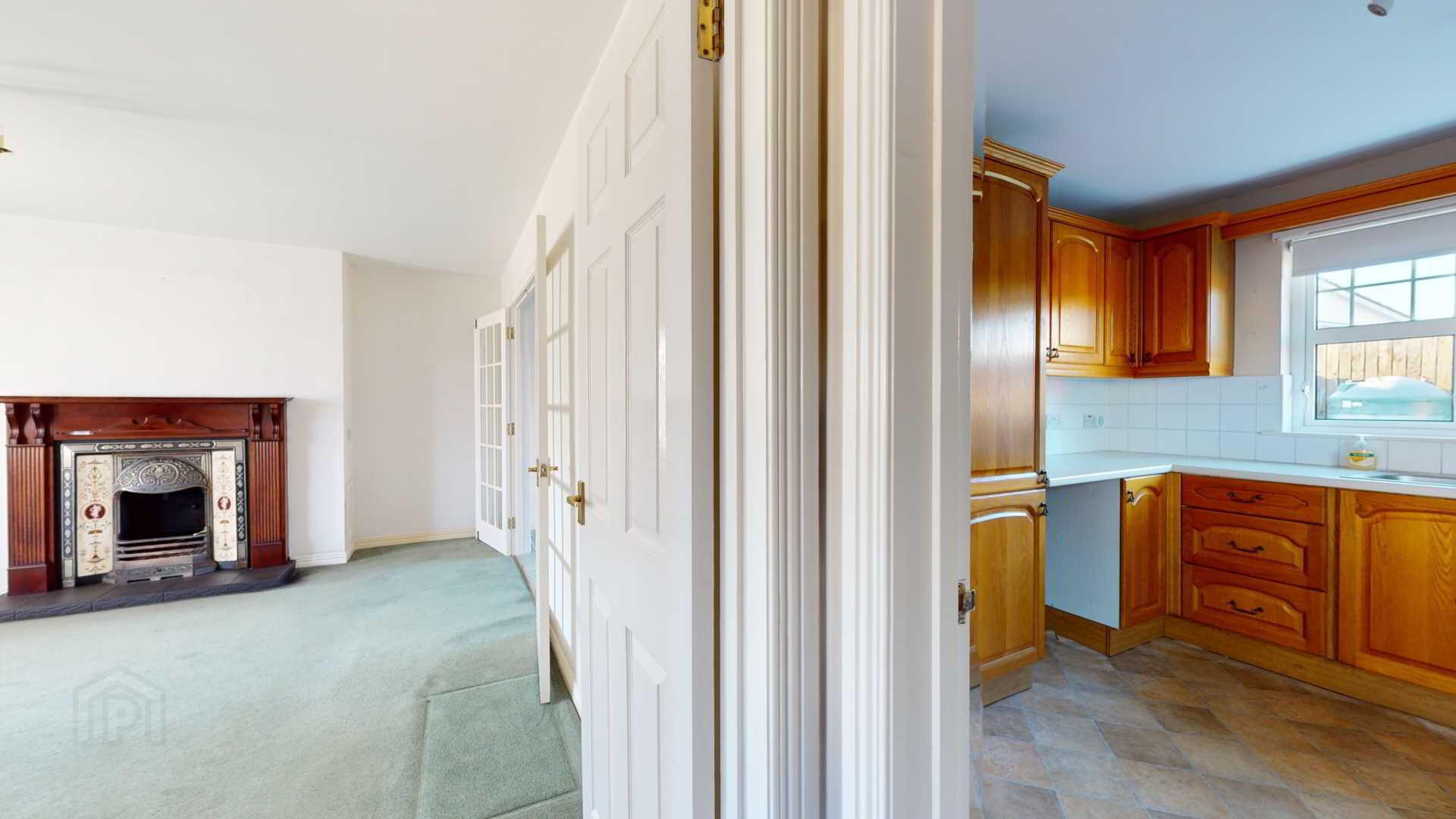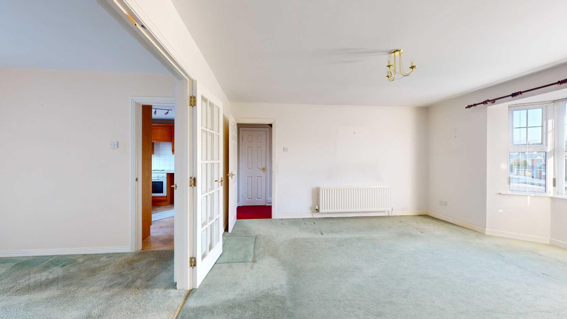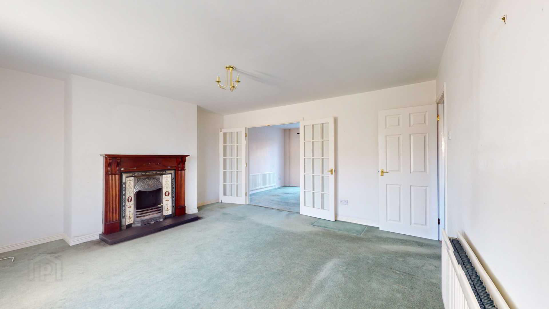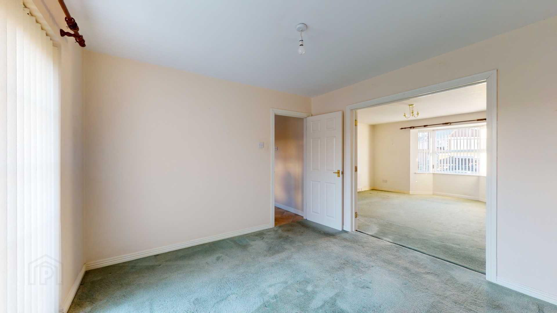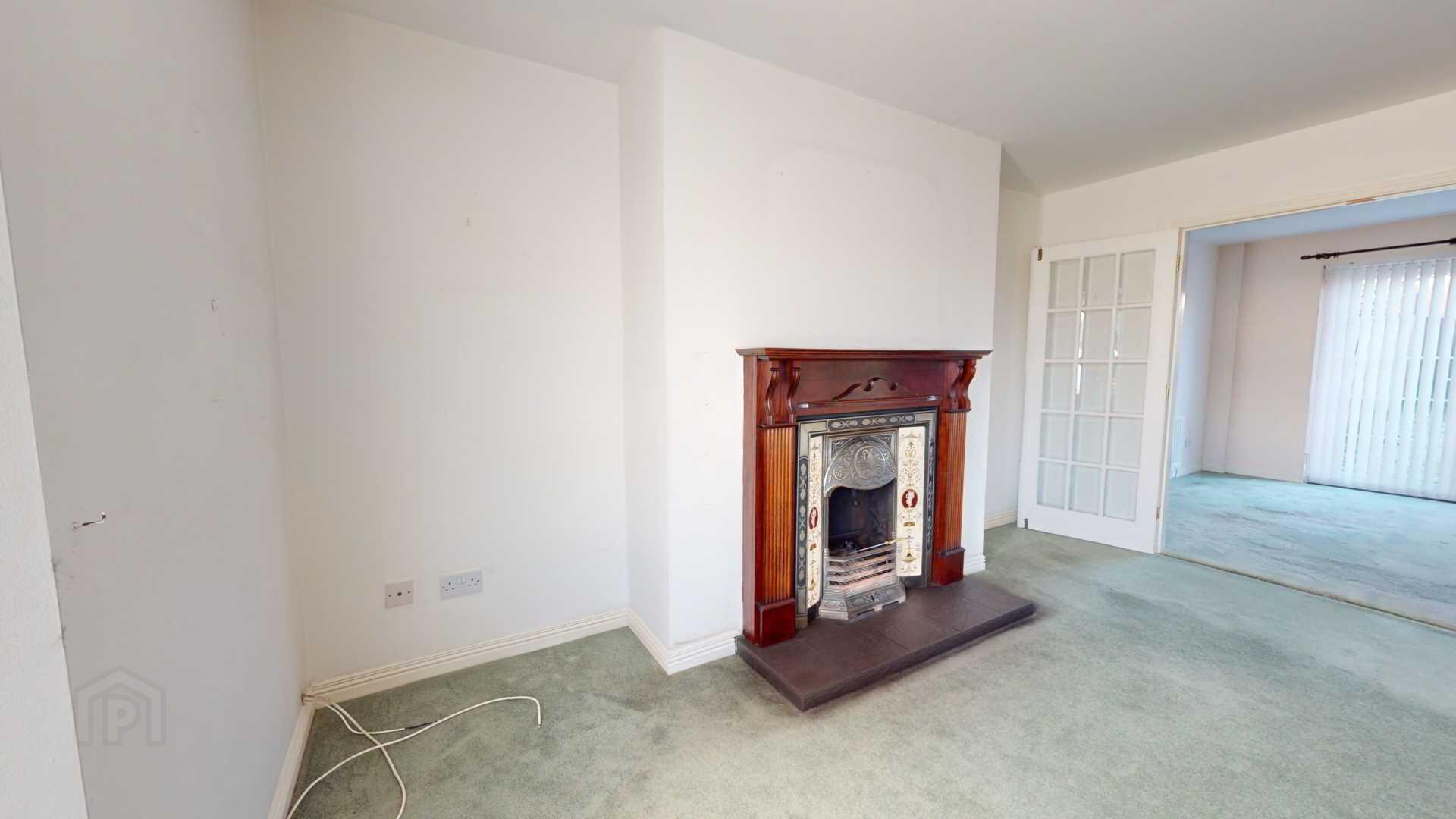 French doors off; carpeted; powerpoints; vertical blinds with French external uPvc door to rear garden; curtain pole.