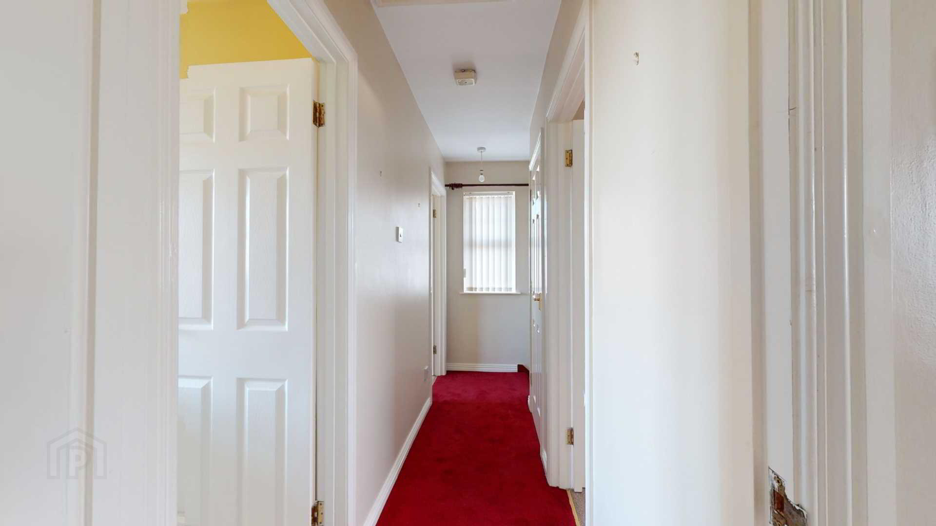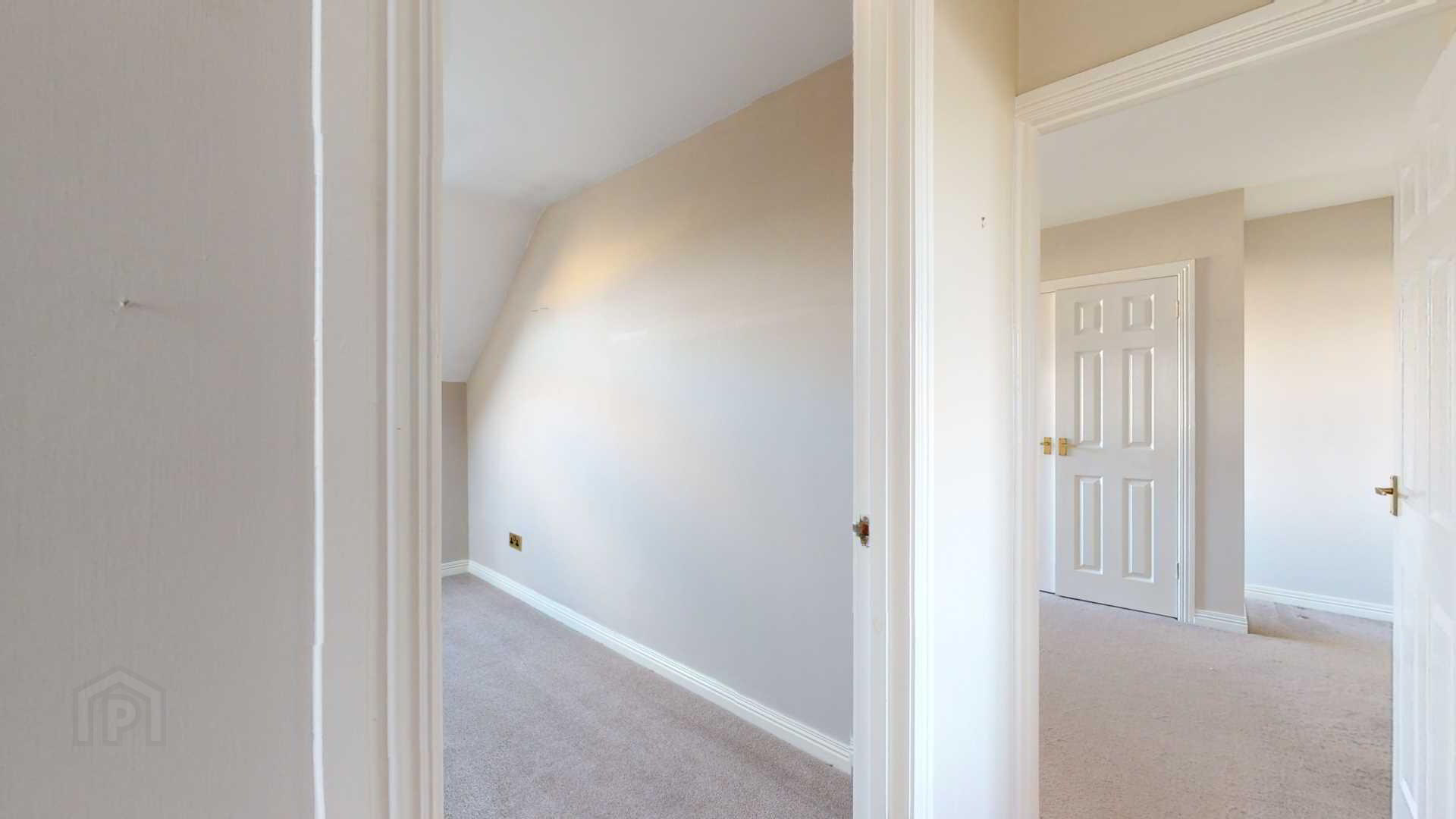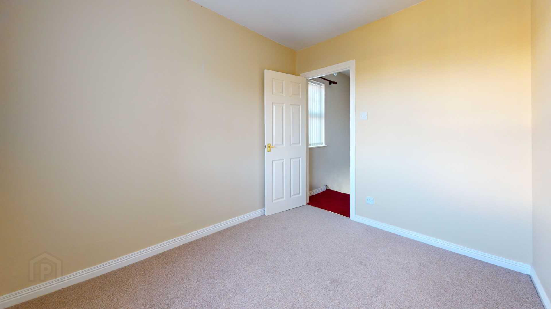 via double glazed uPvc door with side panel; carpeted; power and T.V broadband point; smoke detection; curtain and pole; under stair storage with shelving.