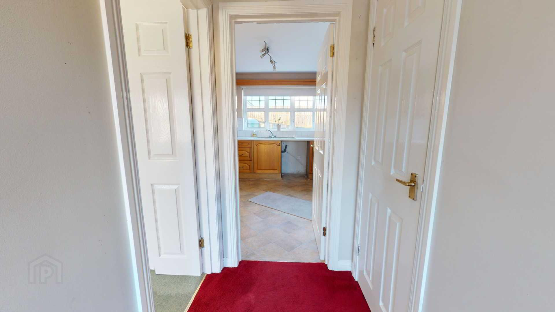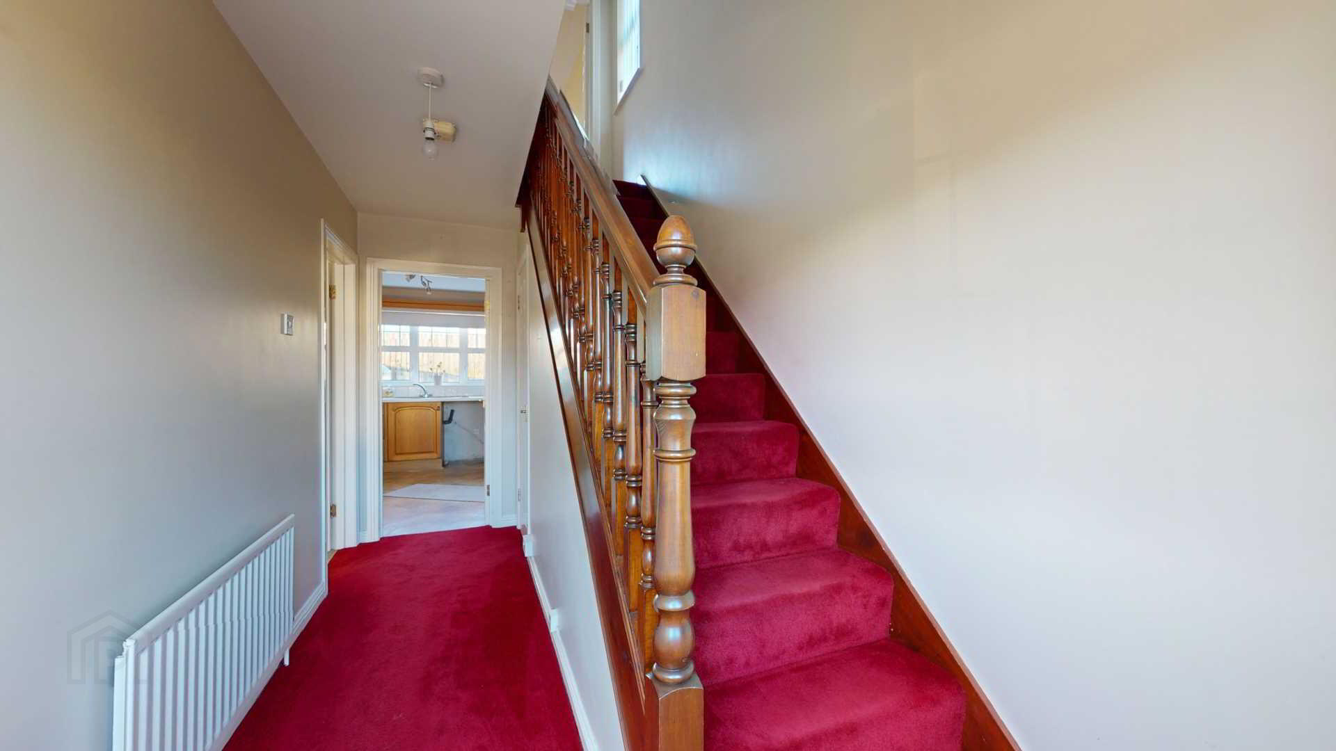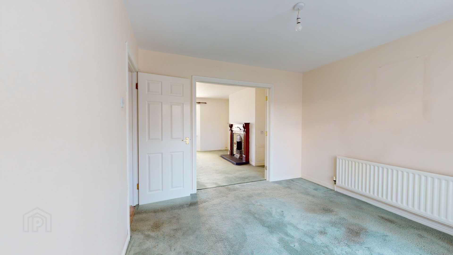via double glazed uPvc door with side panel; carpeted; power and T.V broadband point; smoke detection; curtain and pole; under stair storage with shelving.