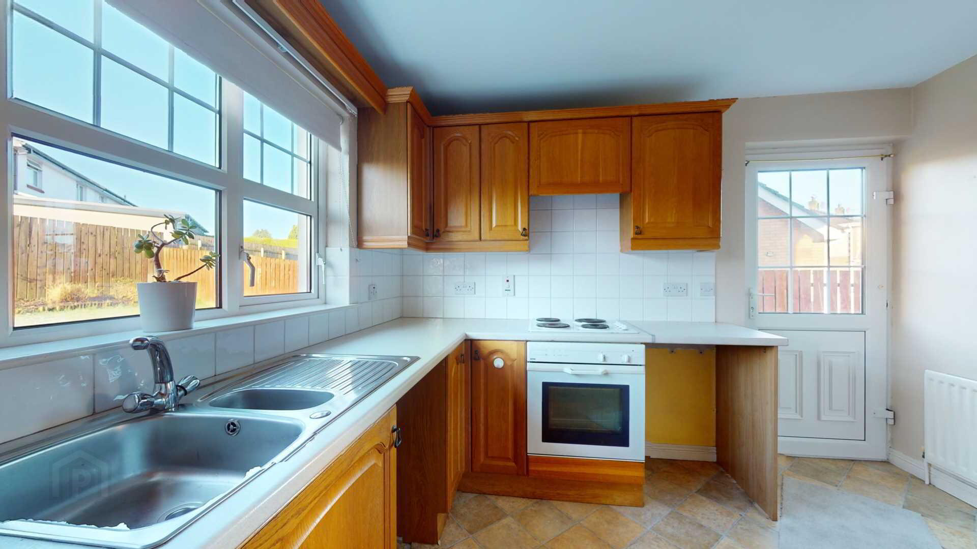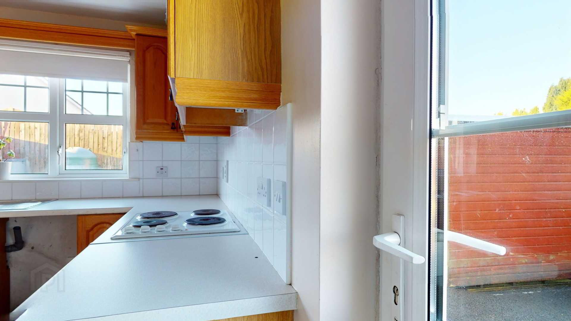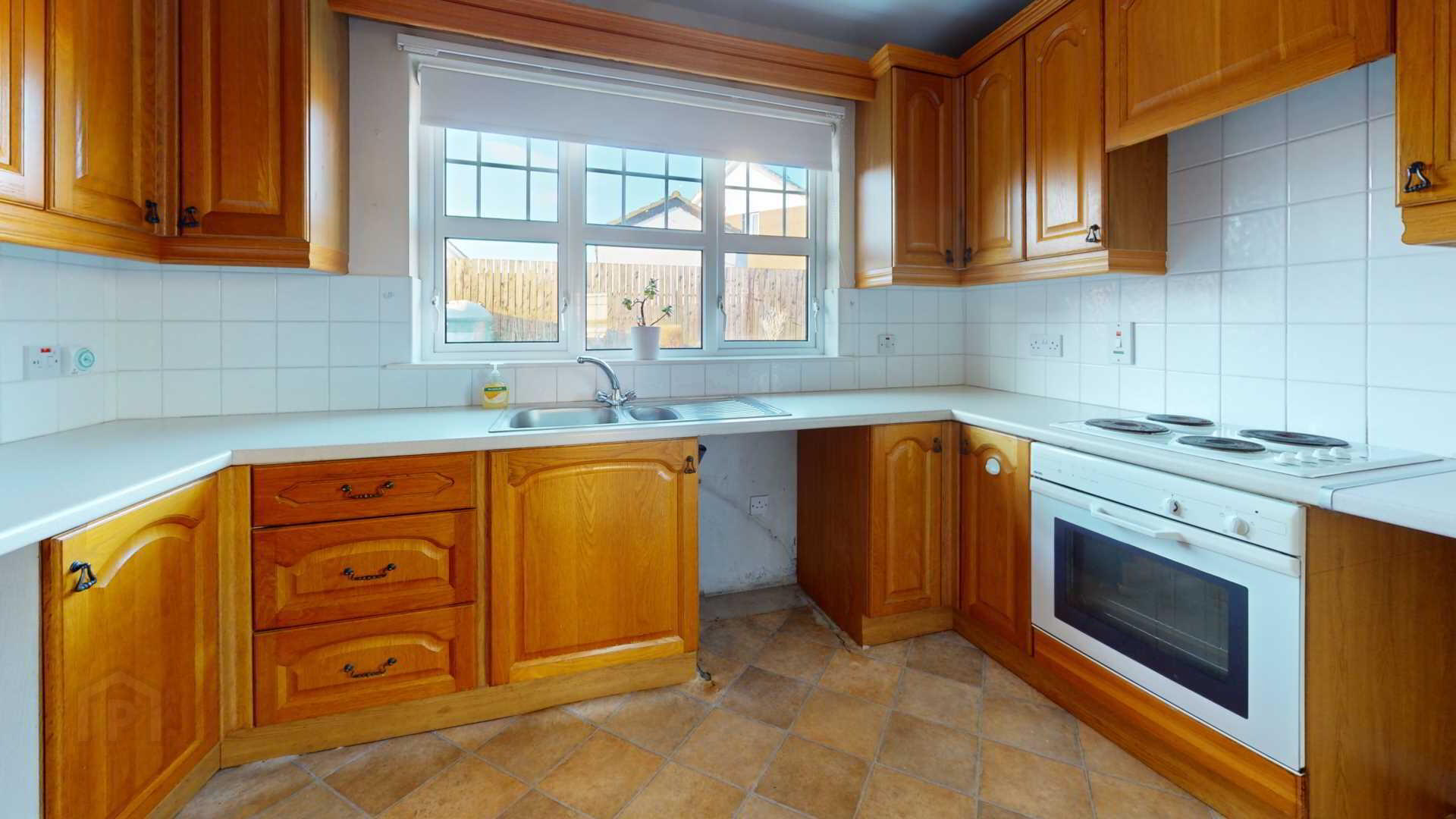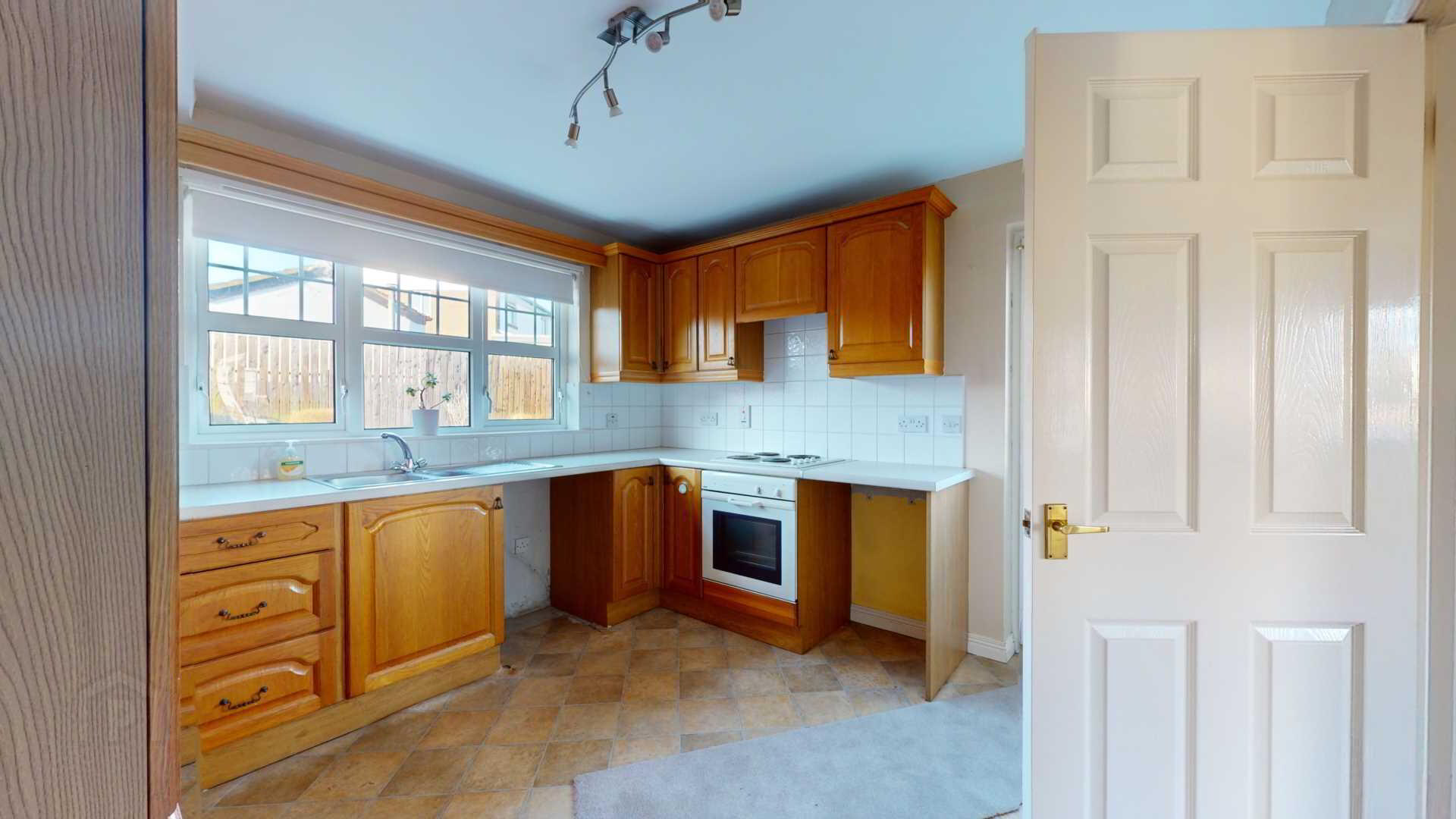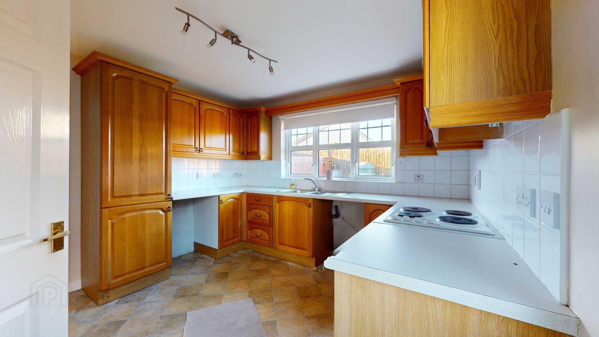 Eye and low level Oak kitchen cupboards with space for Automatic Washing Machine; fridge and freezer; tiled splashback over worktops; `ignis`four plate electric hob with `ignis; multifunction under oven. Extractor fan over cooker with cooking lights; stainless steel single drainer with 1 1/2 bowls. Numerous powerpoints and heating controls; telephone point; vinyl flooring.