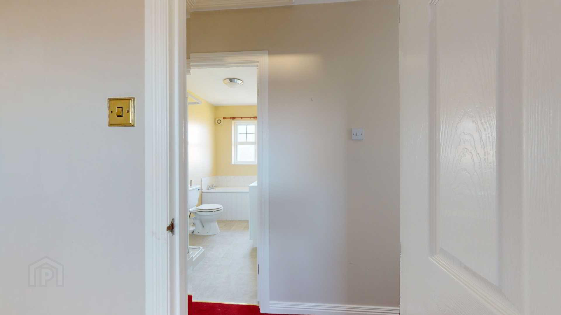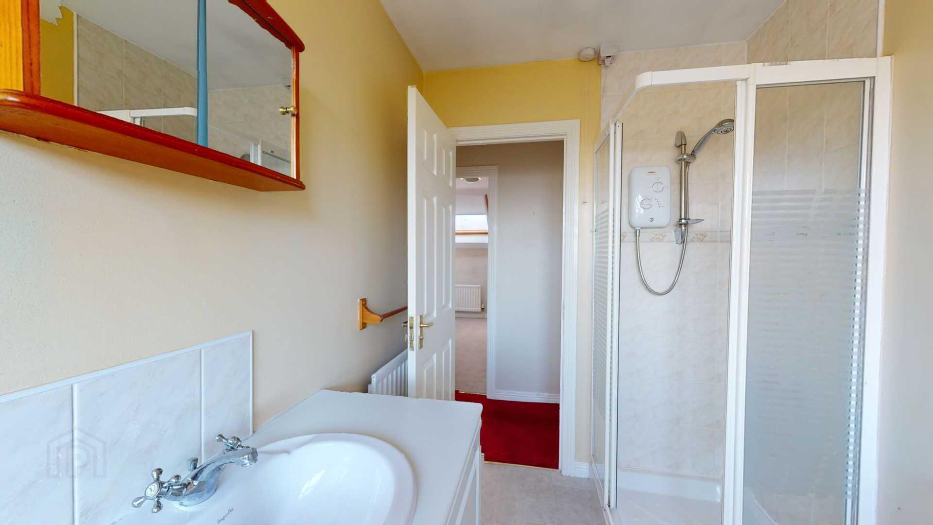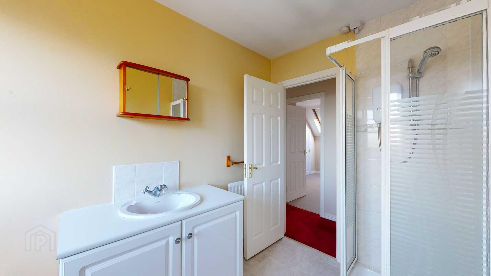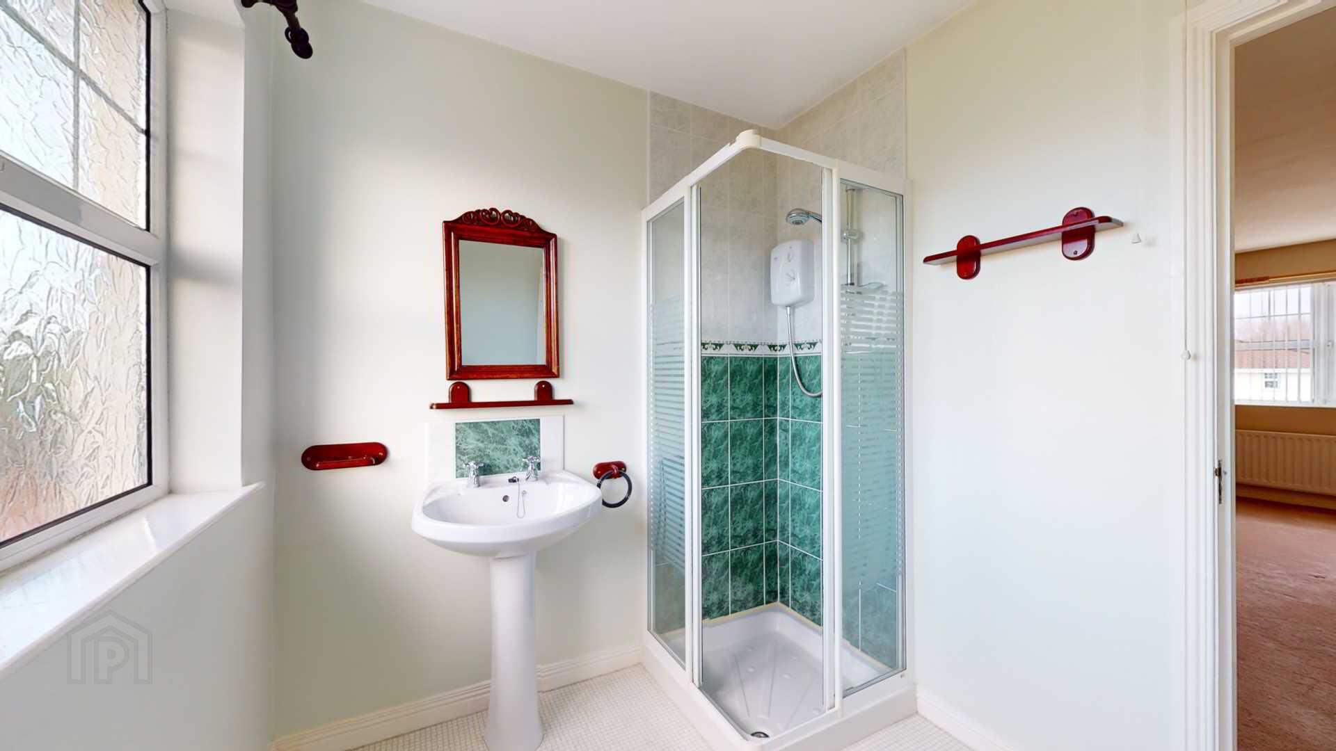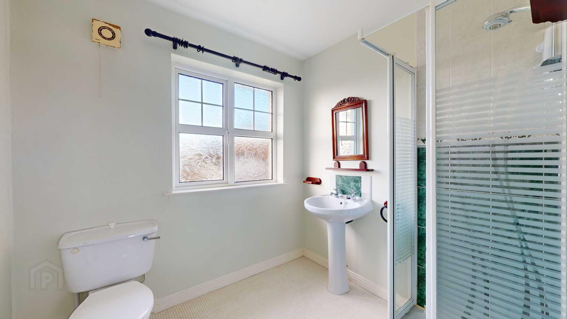 Close coupled water closet; corner tiled shower with `Triton` enrich electric shower; pedestal wash hand basin with tiled splashback; toilet roll, towel & toothbrush holders; wall mounted mirror; vinyl flooring; extractor fan; curtain pole.