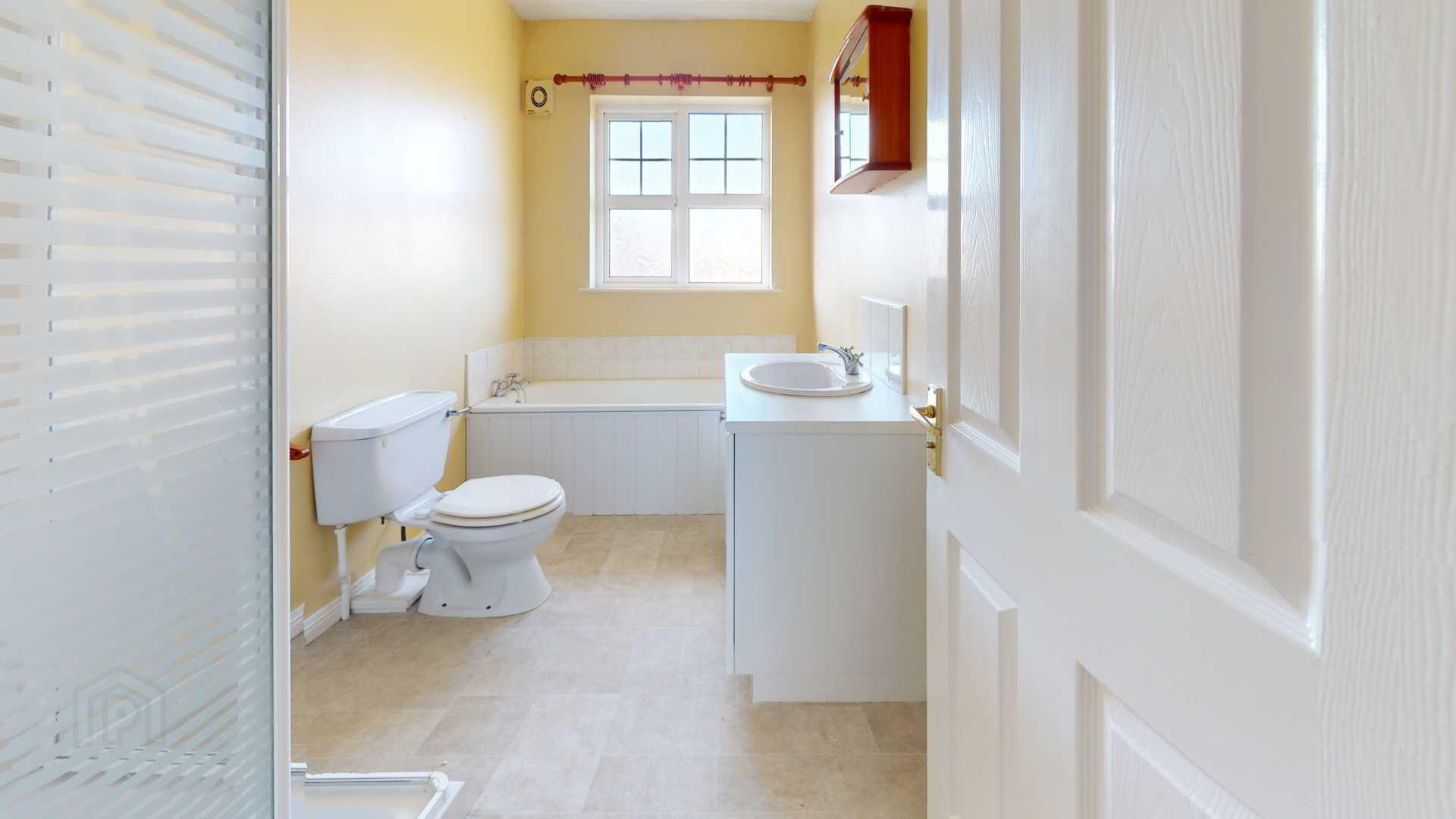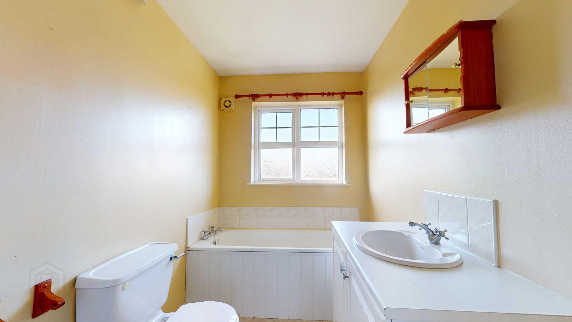 Close coupled water closet; vanity unit with tiled splashback; tiled shower with `Redring` expressions 5005 electric shower; bath with tiled splashback; extractor fan; vinyl flooring; curtain pole; cosmetic cupboard; towel holder.